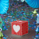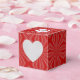Mexican LOVE FLAG shows, on a cube favor box with a heart in front, for your party guests. The word LOVE, using a heart shaped flag as the O, is featured in red letters inside a white, fractal circle of squiggly squares. The circle sits on a red, fractal background, also, of squiggly squares. Design shoes on top of box. Great for your guests at your next occasion or party to celebrate Mexico. Can be customized for Cinco de Mayo or any occasion.