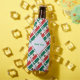 Personalized bottle cooler showing a diagonally tiled version of the Mexican Flag, with the word, MEXICO, underneath, in the colors of the flag. A fractal of white squiggly squares holds a place for your name, to create a personalized look for you or a gift. The Mexican flag is three vertical stripes. One is red, one is white, and one is green. The red stripe is in the center and holds an emblem with an eagle. Great design for travelers and family of Mexican heritage. Fun to take to family reunions. Cool for Cinco de Mayo.