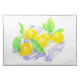 A cheerful and bright watercolor image of Meyer lemons on a blue and white striped kitchen towel. A delightful compliment to your dining experience!
