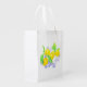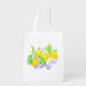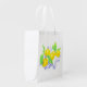 The grocery bag was a nice size and could hold up to 3 medium baby gift boxes. It is a foldable bag with a snap to keep it closed when not in use. Handles were sturdy - felt like it was a good value for what it was intended for. Loved the printing - The Clan name was used with the Clan Tartan for the baby's last name ancestor. A real hit with the new parents to be.