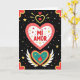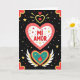 This greeting card shows a big coral-red heart in the center, outlined with small gold dots, set on a black background sprinkled with tiny stars and dots. Inside the heart is a white space with the words “MI AMOR” in red letters that stand out clearly. Above it sits a smaller gold heart with light rays around it, and a tiny red heart tucked inside. Below the main heart, there’s a teal heart with a small flame in the middle, and white wings stretching out on both sides with little gold circles along them. The black backdrop feels like a night sky, with gold and red stars plus scattered white and red dots that look like confetti. The mix of hearts, wings, and flame gives the card a strong love-and-devotion feel 💘❤️. It’s a sweet way to say “my love” and share Valentine’s Day sentiments.