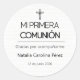 Round personalized sticker for Primera Comunión favors featuring a simple cross and modern Spanish typography. Customize with the child’s name and event date—perfect for sealing treat bags, favor boxes, thank you gifts, and party envelopes for a clean, elegant celebration look.
