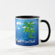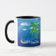 Cute three green palm trees next to a sweeping blue ocean wave and flower motif. White clouds in the sky, and "Miami Beach" in white text.. Great for florida vacations, greetings or travel souvenirs. All Designs Copyright © 2012 www.CuteComfy.com