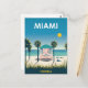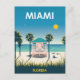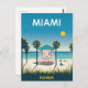 Retro Miami Florida travel poster illustration that features a view of a lifeguard station on a palm-tree-lined, sunny and sandy Miami Beach. This vintage design will bring back memories of classic travel posters from a bygone era.