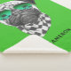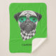 This design features a portrait of pug in with sunglasses and a black and white checkered scarf.