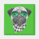 This design features a portrait of pug in with sunglasses and a black and white checkered scarf.