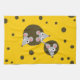 Cute children's illustration of three playful mice peeking out of cheese holes. One mouse peeking from one hole is playfully pulling the other mouse peeking out of another hole by its ear. The whole product is covered by yellow cheese with holes image, so it looks like on big piece of cheese.