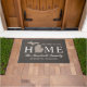 Stylish "Welcome to our home" doormat features a typography design with state of Michigan map. Personalize with your family's last name monogram and your city name. Includes a burlap background layer with a rustic textured appearance. Neutral colors include dark taupe gray, warm gray, and white.