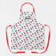 Great color and even though I ordered the kid size, it covers well enough to use during the holidays. I am not a big woman and prefer a shorter apron. I stand 5"6" and the length of the garment goes to mid-thigh. The tie straps fit well at my waist and even though there is no neck strap adjustment, the opening is plenty big enough. I am happy with the size and fit. I am sharing my apron with my 10 year old grandson, too! The color is vibrant and looks good, as shown on the website. The stitching looks strong and reinforced. Photographed is front side and back side of the apron, reinforced straps and coloring. My phone camera may not be the best at showing the details.