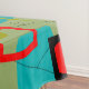 Mid-century modern abstract tablecloth in green with funky abstract shapes in red, blue and black.