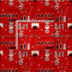 Mid-century modern abstract in red. Design consists of triangles, rectangles, circles in colors black, grey and hints of pale pinkish- cream.