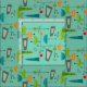 Atomic Age Mid-Century or nuclear era inspired abstract fabric similar to fabrics of the 1940's time period. Unique shapes of half moons, circles, various lines, rectangles and triangles in colors of teal, orange, red, lime green, grey and white on a dark mint colored background. The atomic age also known as the nuclear time period was popular to represent the making the first nuclear bomb. This fabric would be perfect for making pillows, bedding or clothing for anyone who loves and appreciates the mid-century time period. All designs are original and created by Gail Gabel, Ohio.