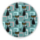 Colorful abstract Mid Century style pattern with black cat, black stars and colorful (blue, white, pink) cubes decoration on turquoise background for every cat lover, cat mom and cat dad.