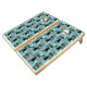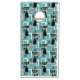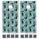 Colorful abstract Mid Century style pattern with black cat, black stars and colorful (blue, white, pink) cubes decoration on turquoise background for every cat lover, cat mom and cat dad.