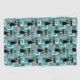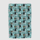 Colorful abstract Mid Century style pattern with black cat, black stars and colorful (blue, white, pink) cubes decoration on turquoise background for every cat lover, cat mom and cat dad.