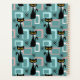 Colorful abstract Mid Century style pattern with black cat, black stars and colorful (blue, white, pink) cubes decoration on turquoise background for every cat lover, cat mom and cat dad.