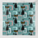 Colorful abstract Mid Century style pattern with black cat, black stars and colorful (blue, white, pink) cubes decoration on turquoise background for every cat lover, cat mom and cat dad.