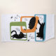 Colorful abstract Mid Century style illustration with black cats, black stars and colorful cubes decoration on white background