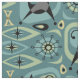 My original vector illustration of mid century style abstract cats, cubes, starbursts, boomerangs, lozenges, and more, in shades of blue, green, grey, and black on teal.