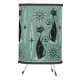 For the cat loving, retro enthusiast, my original vector illustration of sleek black cats, sunburst clocks, starbursts, & diamonds in mid century atomic style, in black, shades of spearmint and a hint of pink.