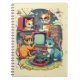 Notebook in a whimsical illustration featuring four playful cats enjoying retro media devices. One cat sits beside a vintage TV, while another, wearing red glasses, is perched on stacks of books and records. A turntable and cassette player evoke a mid-century aesthetic.