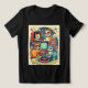 T-Shirt in a whimsical illustration featuring four playful cats enjoying retro media devices. One cat sits beside a vintage TV, while another, wearing red glasses, is perched on stacks of books and records. A turntable and cassette player evoke a mid-century aesthetic.