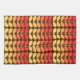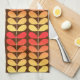 Kitchen towel in a Mid-Century Modern Danish inspired textile pattern of stylized leaves - fire colors shading from deep mandarin orange to golden yellow, accented with tan, on a dark chocolate brown background
