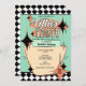 Fifties Party Invitation features mid-century modern sign style typography of "Fifties Party''. This design includes elements of mint green, orange, black and white, checkered pattern, polka dot background, retro shapes, stars and designs inspired by the 50's. Include a template for personal customization.