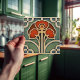 This exquisite mid-century modern ceramic tile is a loving homage to the time-honored Arts and Crafts movement. Expertly crafted in our Barcelona workshop, it features abstract symmetrical shapes and imitates the captivating allure of mid-century modern faux relief tiles. The symmetrical designs echo a harmonious balance, the ideal expression of abstract aesthetics of mid-century modernism.
