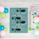 For the retro cat lover, my original vector illustration of sleek black cats, starbursts, & diamonds in mid century atomic style, in black & pale gray on a cadet blue background, with simulated fabric grain. ©Christine Duffield 2019