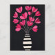 Striking magenta petals bloom from a classic black-striped vase on a light mint background for vibrant vintage cool.