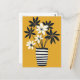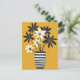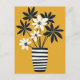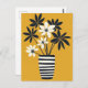Sunny golden petals emerge from a bright white-striped vase on bold cobalt blue—warm, cheerful, and clean.