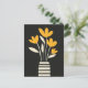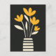 Mustard-colored petals bloom from a solid black-striped vase, coolly offset by an aqua background.