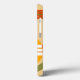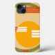 This phone case has a mid-century modern abstract design of a gold circle inside a green circle with orange and white stripes.