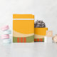 This wrapping paper has a mid-century modern abstract design of a gold circle inside a green circle with orange and white stripes.