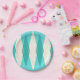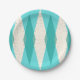 These Mid Century Modern Argyle Paper Plates (large print) feature a vibrant, turquoise background and a pattern of mod, translucent teal diamonds overlaying larger, vintage cream diamonds with gold colored, space age speckles. This minimalist inspired, deconstructed argyle is a simplistic throwback of the larger than life atomic era that dominated the decorating landscape of the 1950s and 1960s. This kitschy design is reminiscent of everything from retro Palm Springs’ bowling alley signs to the television trays you used at your grandma’s house.