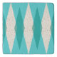 This Mid Century Modern Argyle Stone Trivet features a vibrant, turquoise background and a pattern of mod, translucent teal diamonds overlaying larger, vintage cream diamonds with gold colored, space age speckles. This minimalist inspired, deconstructed argyle is a simplistic throwback of the larger than life atomic era that dominated the decorating landscape of the 1950s and 1960s. This kitschy design is reminiscent of everything from retro Palm Springs’ bowling alley signs to the television trays you used at your grandma’s house.