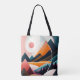 Carry your belongings in style with our captivating abstract mid-century modern art tote bag. This stunning bag features a mesmerizing depiction of mountains and a sunset, capturing the essence of natural beauty and wanderlust. With its spacious interior and sturdy construction, this tote bag is not only a fashionable accessory but also a practical companion for your daily adventures, allowing you to showcase your love for art wherever you go.