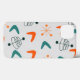 This phone case has a mid-century atomic modern design of boomerang shapes, antennae, and starbursts in teal, orange.