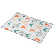This placemat has a mid-century atomic modern design of boomerang shapes, antennae, and starbursts in teal, orange.