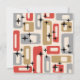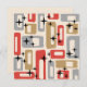 A festive mid-century composition featuring red, gold, and gray rectangles scattered across a soft beige background, punctuated by crisp black starbursts. The geometric layout evokes vintage holiday wrapping paper and atomic-era ornamentation, blending bold shapes with twinkling accents. The palette channels cozy retro cheer, while the rhythmic repetition of forms adds a playful, celebratory energy—perfect for Christmas décor with nostalgic flair and graphic charm.
