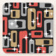 A festive mid-century composition featuring red, gold, and green rectangles scattered across a black background, punctuated by crisp white starbursts. The geometric layout evokes vintage holiday wrapping paper and atomic-era ornamentation, blending bold shapes with twinkling accents. The palette channels cozy retro cheer, while the rhythmic repetition of forms adds a playful, celebratory energy—perfect for Christmas décor with nostalgic flair and graphic charm.