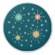 This artwork bursts with classic mid‑century modern energy, featuring bold atomic starbursts radiating across a deep teal backdrop. Each large starburst—rendered in bright orange, soft blue, citrus yellow, and fresh green—anchors the composition with playful symmetry and vintage charm. Smaller cream starbursts scatter between them, adding rhythm and movement reminiscent of 1950s space‑age design. The result is a lively, nostalgic pattern that feels both retro and timeless, perfect for décor, textiles, or any project seeking that iconic mid‑century spark.