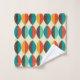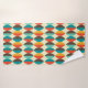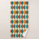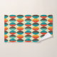 Mid-Century modern bathroom towel. Pointed oval, lens shapes pattern. Colors in red, turquoise, yellow and brown.