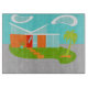 This Mid Century Modern Cartoon House Cutting Board will have you wanting to put out the WELCOME mat and make yourself at home! The 1960's, minimalist art design features a sleek, orange stone and aqua glass house on a lush, green, boomerang shaped lawn. The lawn forms an oasis in the middle of its grey, concrete surroundings. A green palm tree is swaying in the breeze. Four, orange stepping stones lead the way to the retro, red, front door with three, rectangular, glass window panes. To the left of the door, a turquoise flowerpot holds a tropical, green plant. The house has a sloping, V shaped white roof that is pointing toward two, white, kidney bean shaped clouds. The sky is a positively serene shade of aqua. No one will want to throw stones from this modern, glass house design! Buy this kitschy, space age product and be the coolest cat on your block!
