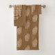 Towel set in a Mid-Century Modern, retro cat design, in a geometric spiral pattern - beige, tan and light brown, outlined in dark chocolate brown, on a medium cocoa brown background