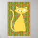 This fun poster features a bold retro inspired design in shades of orange, olive green and blue with a bright yellow cat.