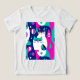 Shirt in a mid-century modern-inspired design featuring two stylized cats in bold, geometric shapes of turquoise, magenta, dark blue, and white. Abstract patterns and retro shapes fill the background, giving it a fun, vintage vibe with a minimalist edge.