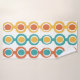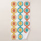 This towel set has an orange washcloth, a gold hand towel, and a bath towel with a mid-century modern design of circles connected together making a chain with white and colored circles inside. Want different colors? Message me.