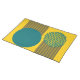 This placemat has a mid-century modern design of circles with lines coming out of them in teal and black on a field of gold.